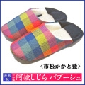 阿波しじら織を使ったバブーシュです。 北アフリカにあるモロッコ王国で作られ続け、今もなお愛されるバブーシュ。徳島伝統の織物「阿波しじら織」を甲部分に使っています。 徳島県のスリッパ専門メーカー「アイブルー」の工場で製造している、100%国内生産のルームシューズです。 足にフィットして、軽くて滑りにくく、2階で使用しても音が少なく、歩きやすい。阿波しじら織のカラフルな柄が良く合います。